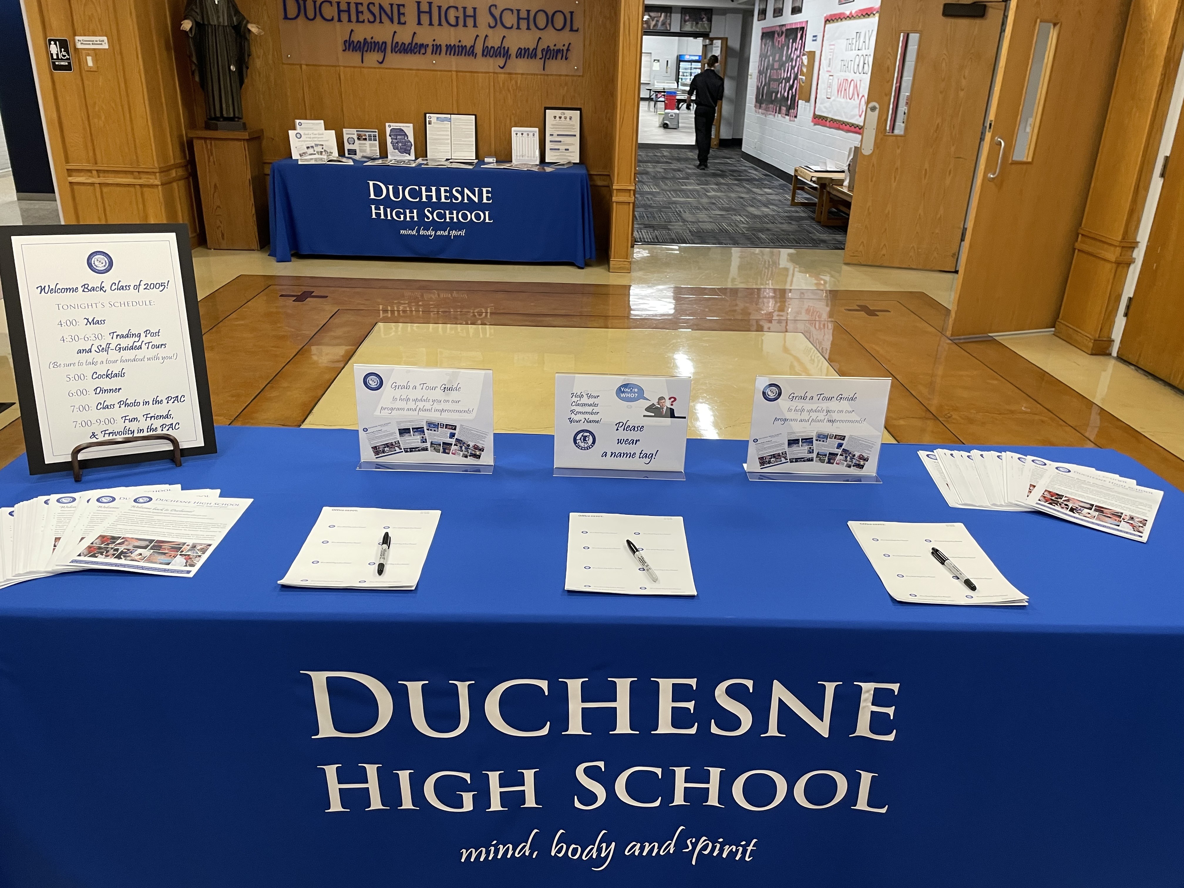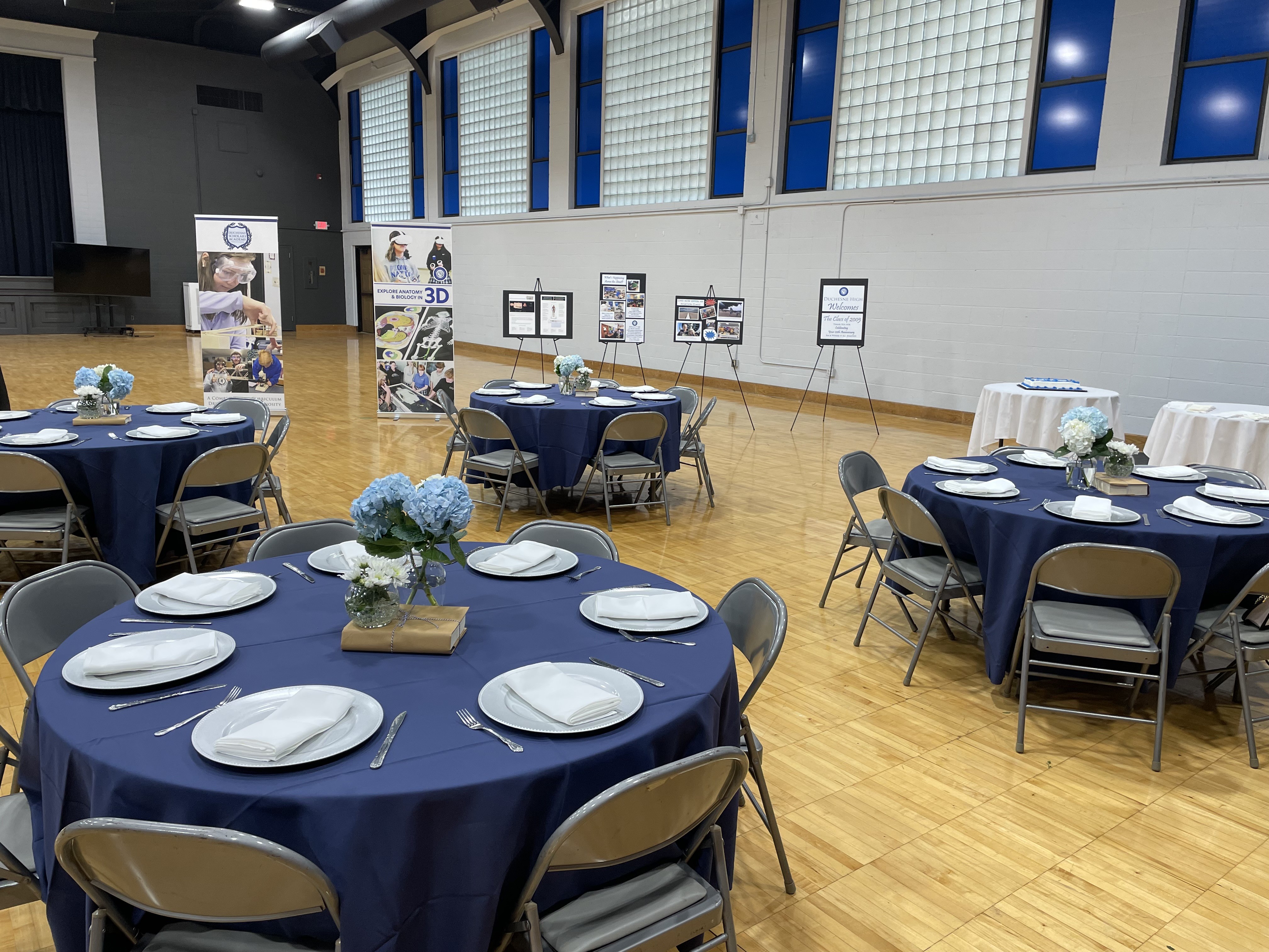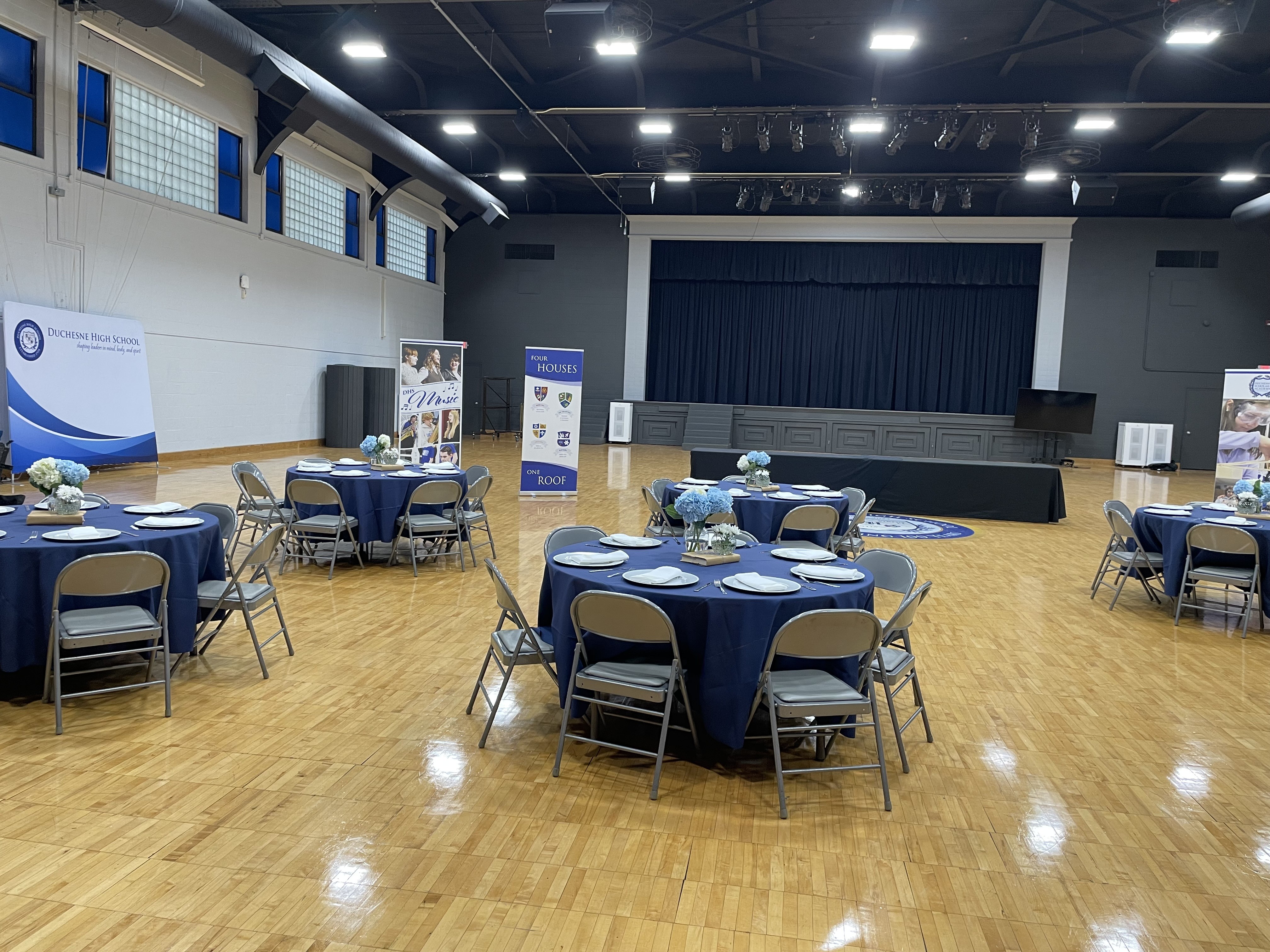 Duchesne charges only $250 to use the PAC for your reunion. Some decorative items are available for loan. Student tech assistance is available for a small fee if you would like tunes from your time to be played at the party.