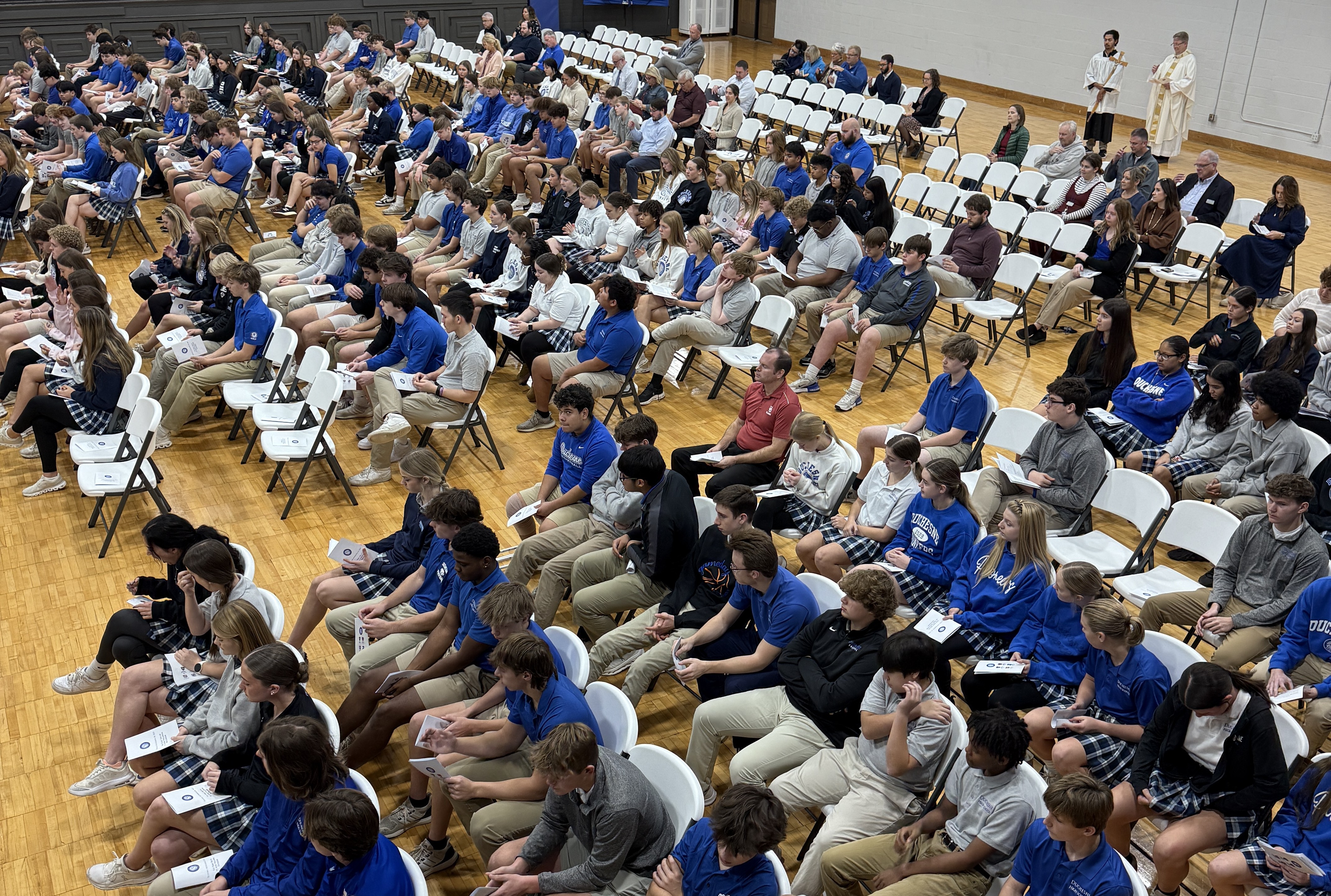 What a Great Day to be a Pioneer! Our all-school Mass on our patroness's Feast Day included special guests such as DHS parents, Board members, and friends from the Archdiocese's Office of Catholic Education and Formation. Everyone was quite comfortable, thanks to the new folding chairs made possible by a gift from Tina Kelly '88. Fr. John Brockland did a beautiful job with his homily, relating the life of St. Rose Philippine Duchesne to our own. Then he blessed the third-class relic St. Rose Philippine Duchesne medallions, donated to our students and faculty by Ann (Johannesman) Tollefson '76. Each attendee at this holy celebration took home a reminder to live by example, as